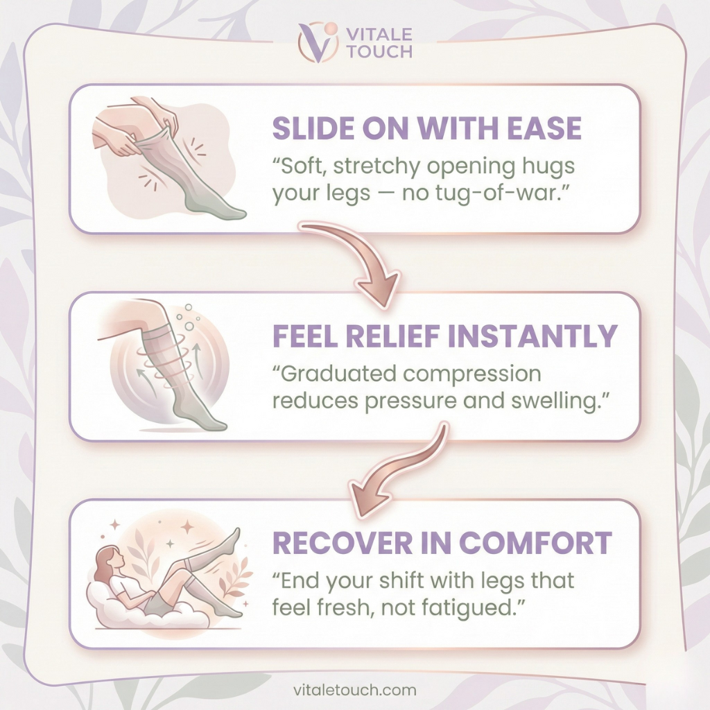 Designed with healthcare heroes in mind, Vitalé Touch Compression Socks deliver all-day relief for tired legs, swollen feet, and long hours on your feet. Experience spa-level comfort, no matter how demanding your day gets.