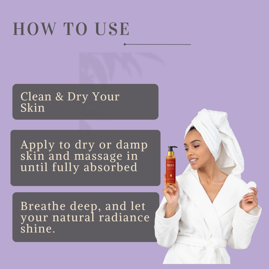 Each drop of our Magic Body Oil is crafted with nature’s richest botanicals to deeply nourish, protect, and transform your skin.