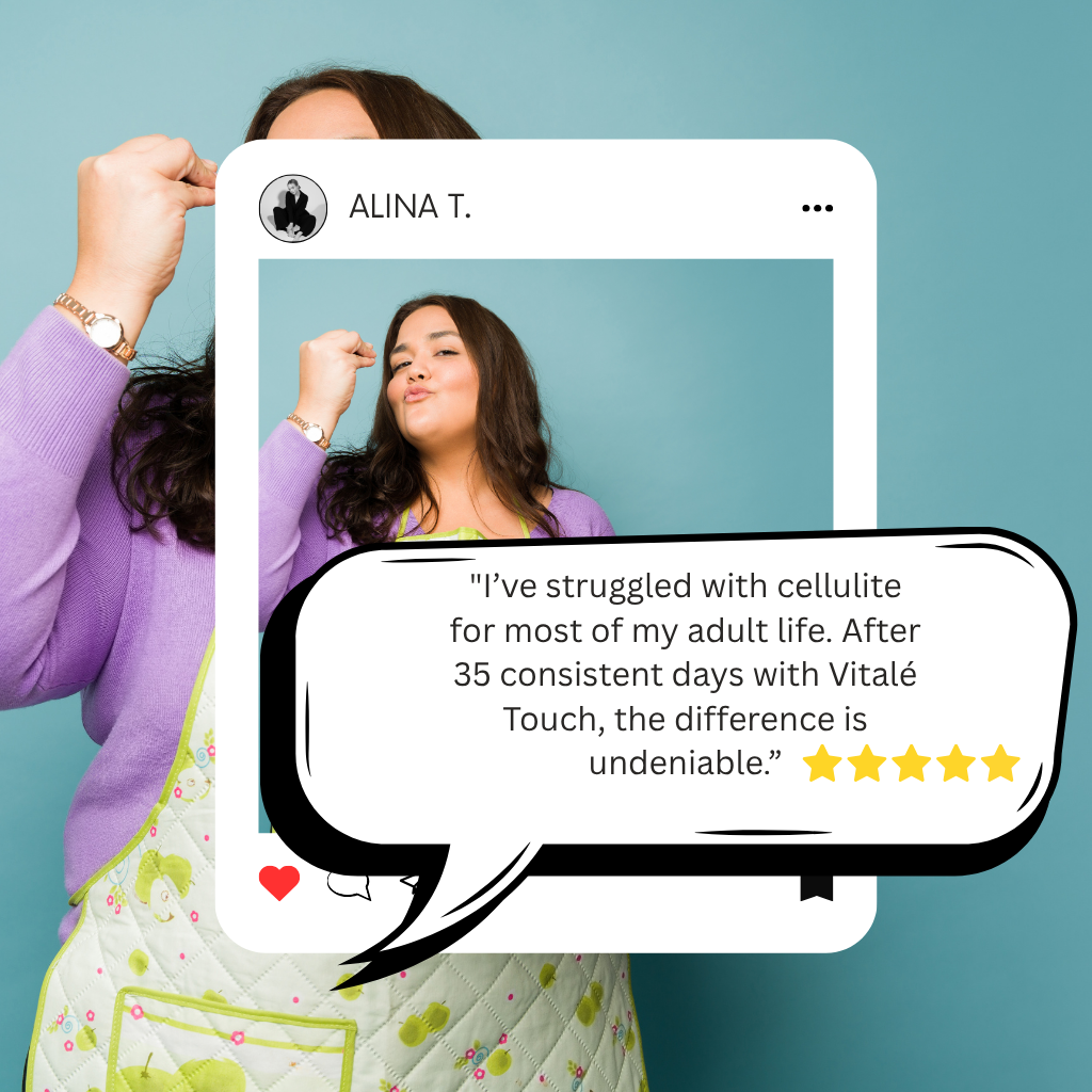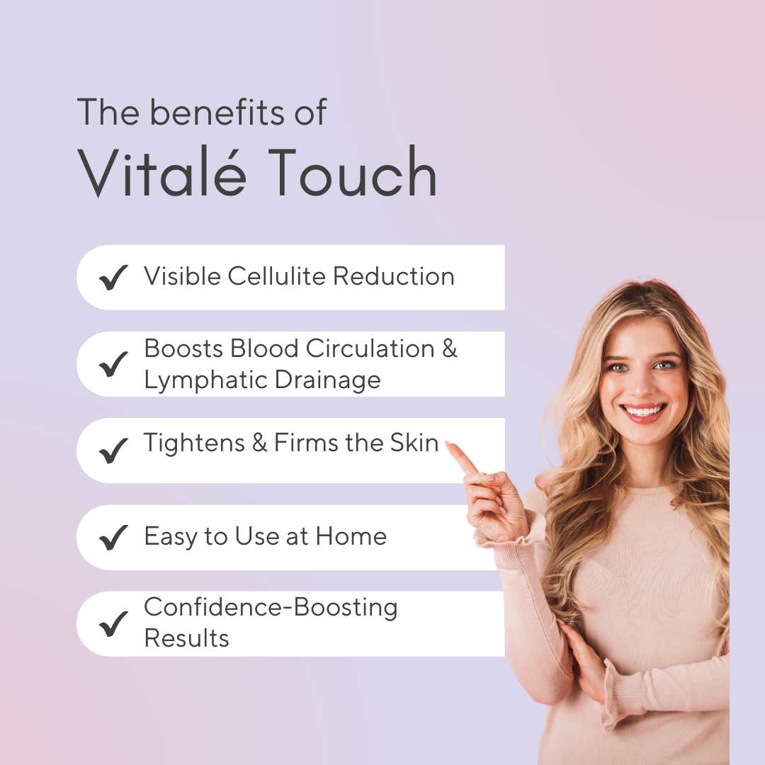 “As a dermatologist, I often see patients frustrated with topical creams that only offer temporary results. What makes the Vitalé Touch device stand out is that it targets cellulite from the inside out — combining suction, heat, and vibration to stimulate circulation and smooth the skin naturally. It’s safe, easy to use at home, and shows promising visible results in just weeks.”